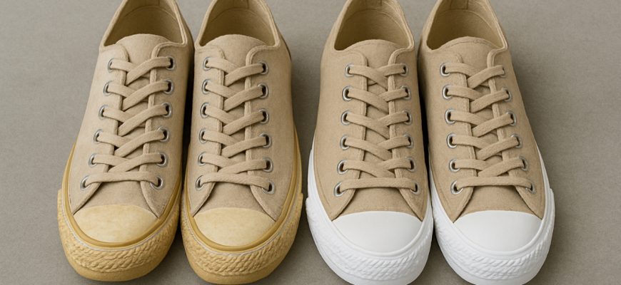Но как бы аккуратно мы ни носили любимую пару, со временем белоснежный цвет тускнеет, появляются жёлтые разводы и следы грязи.