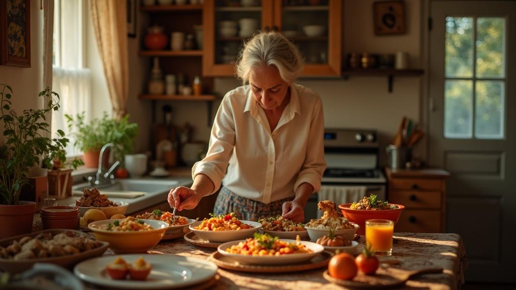 Тамара суетилась на кухне с самого утра, занималась приготовлением блюд, раскладывала их по тарелкам и внимательно проверяла, всё ли готово для празднования.