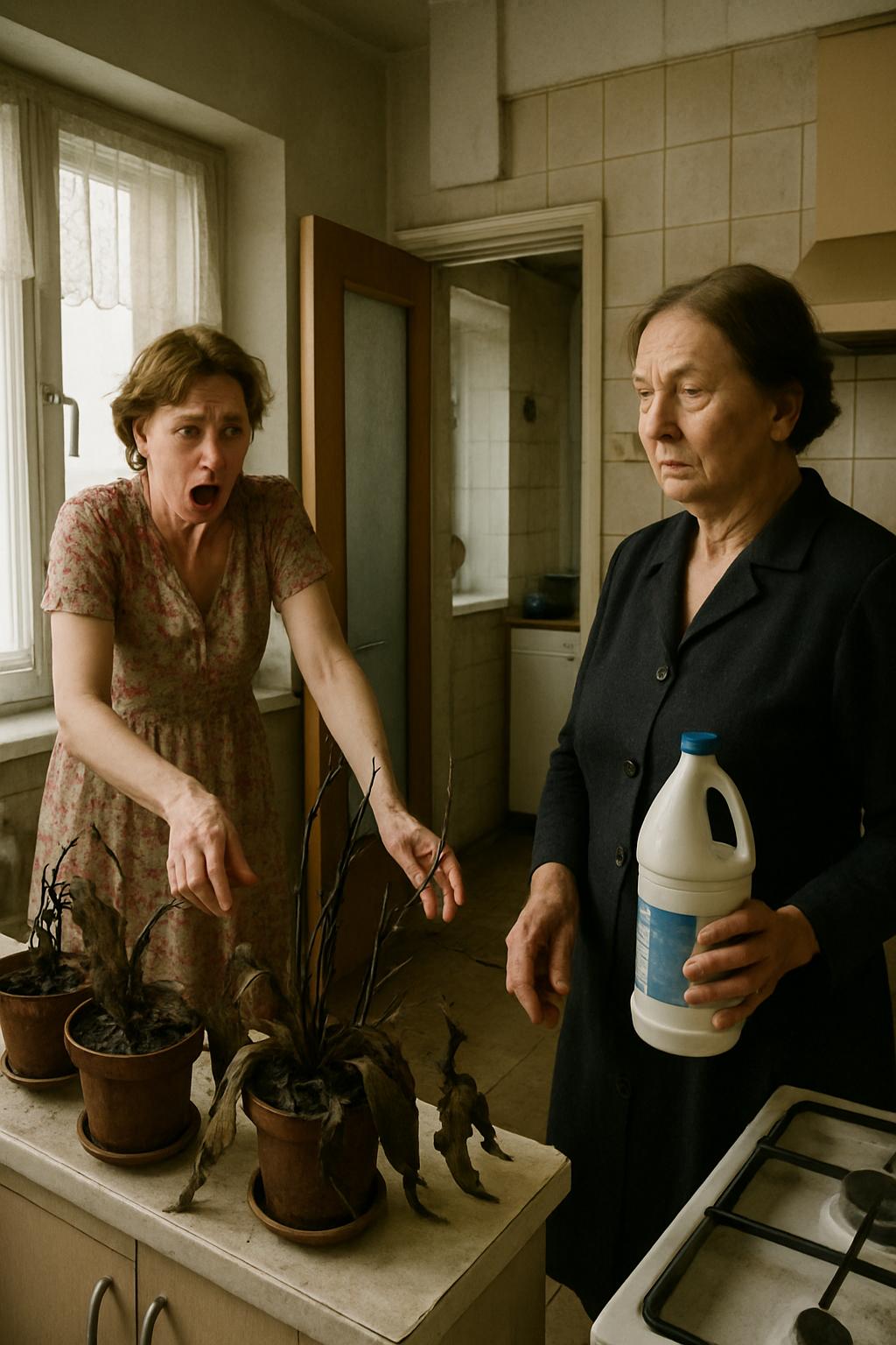 Ольга стояла в центре кухни, бледная как полотно, с руками, испачканными в земле и погибших листьях.