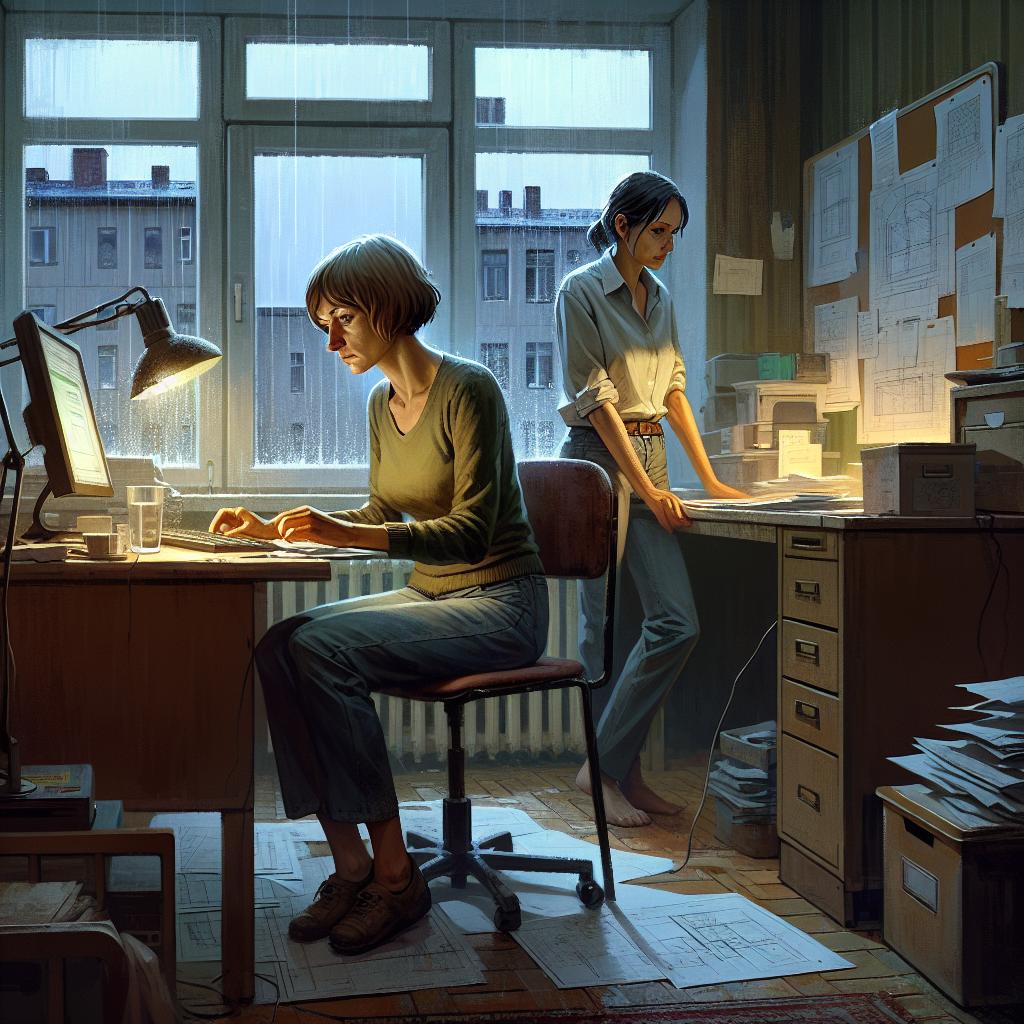В тот день мелкий дождь падал непрерывно и монотонно, словно пытаясь не только смыть пыль с асфальта, но и стереть все человеческие надежды. Конец рабочего дня в проектном бюро тянулся особенно тяжело — клиент в последний момент потребовал внести изменения в проект, из-за чего всей команде пришлось задержаться. Я устало уставилась в монитор, пытаясь сосредоточиться на чертежах, когда над моим столом появилась тень.