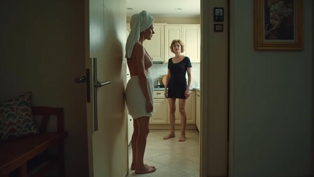 Она стояла в дверном проёме, ведущем из коридора на кухню, закутанная лишь в махровое полотенце, с меньшим полотенцем, намотанным на мокрые волосы.