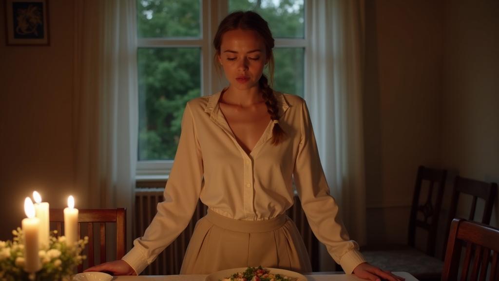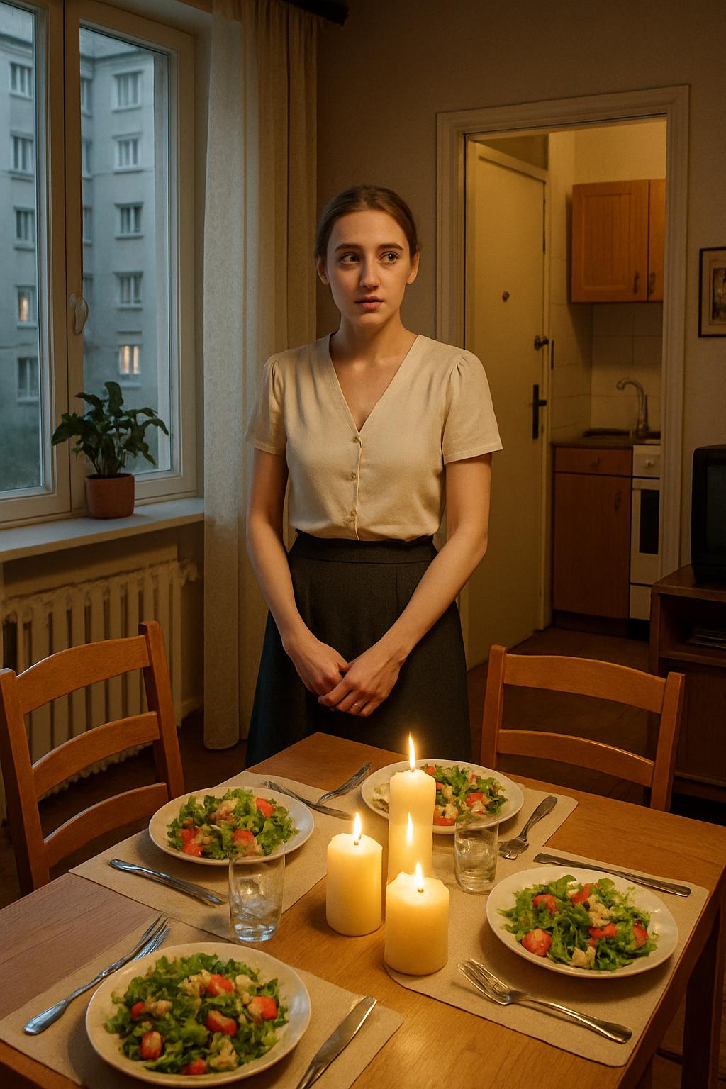 Салаты уже были расставлены, горячее приготовлено, на столе стояли бокалы и зажжённые свечи.