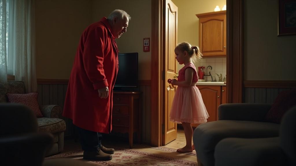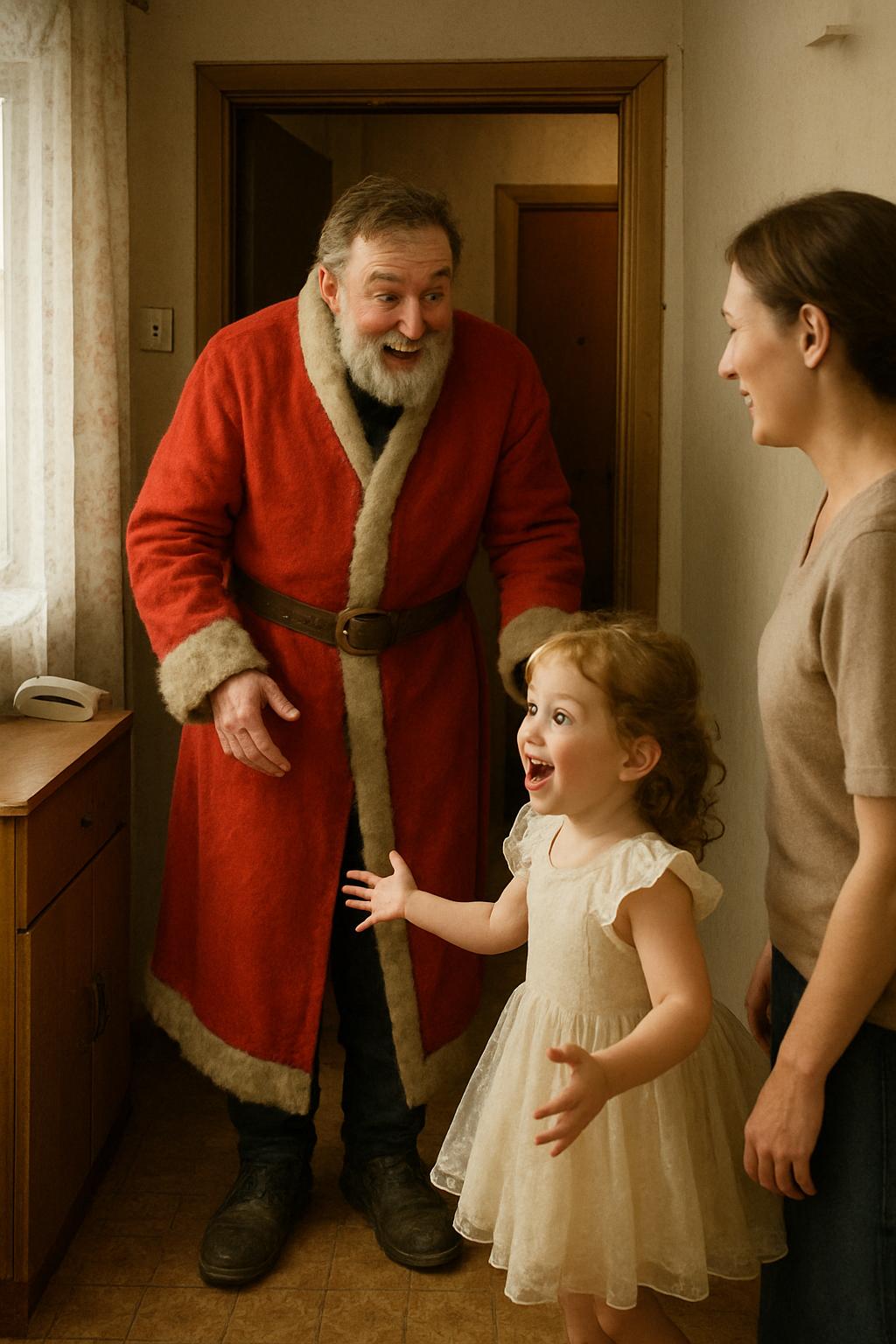 Он стоял в дверном проёме, одетый в красную шубу, с бородой, слегка набок, и мешком, перекинутым через плечо.