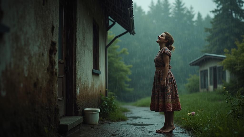 Невысокая, аккуратная, в свежем цветастом переднике, босая, на голове — шалашик белой косынки, на котором блестели частые капли рябины… Вспыхнула молния.