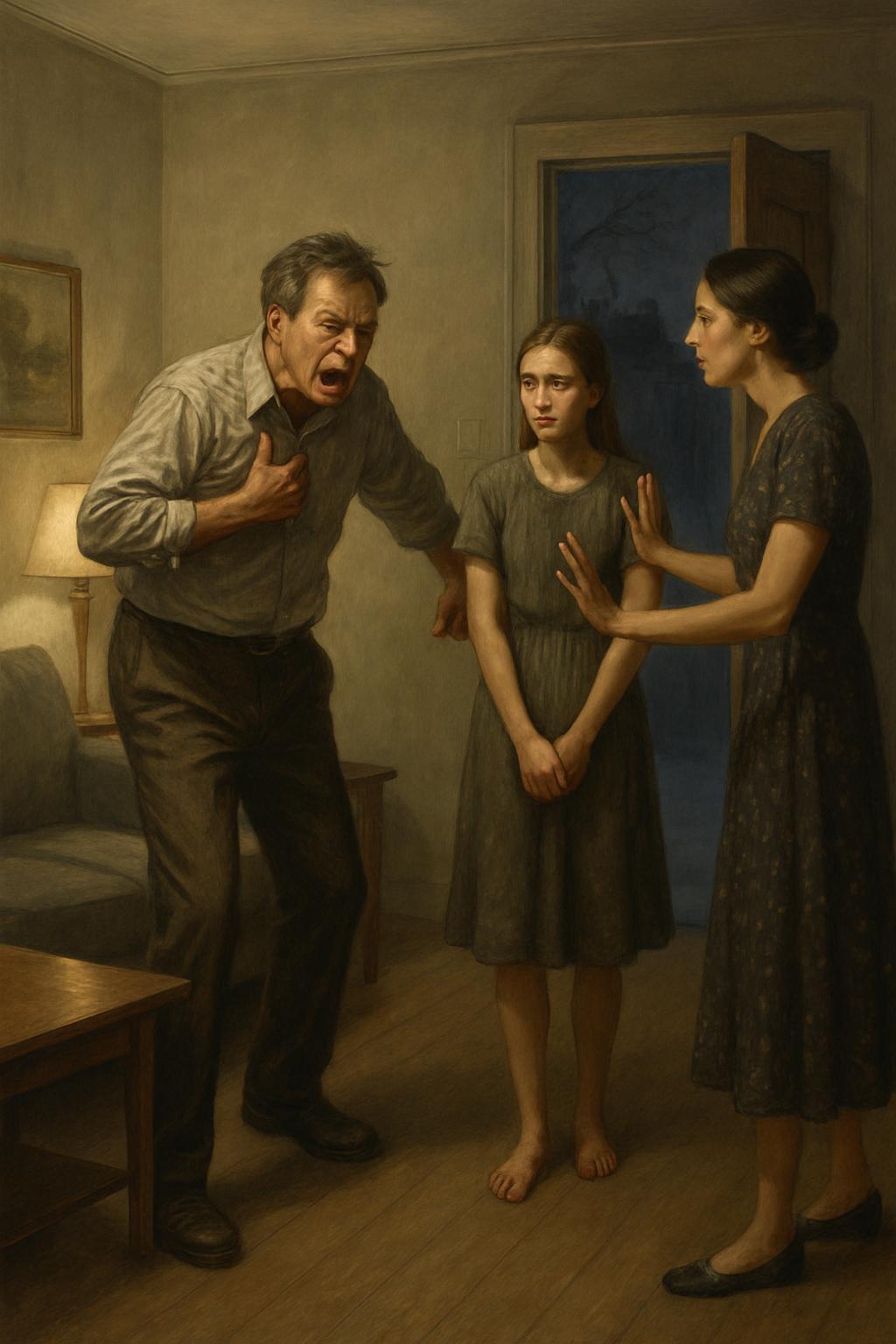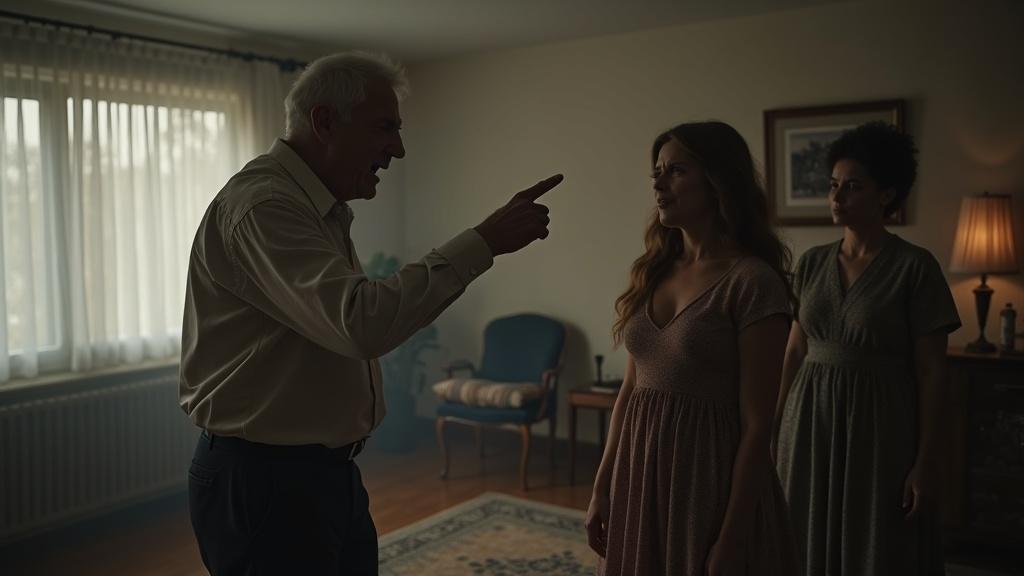 Он плюнул в угол комнаты, злобно уставившись на дочь, затем резко развернулся и, прихрамывая, направился к выходу из просторной гостиной.