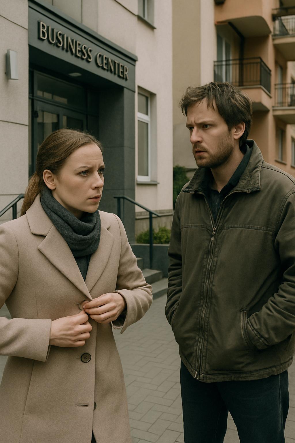 Обратившись, она увидела мужа, стоящего у входа в бизнес-центр.