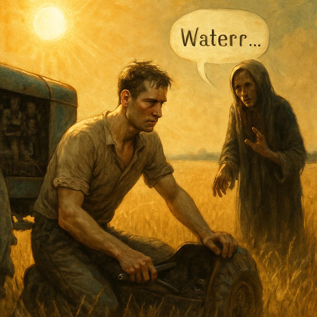 Она появилась бесшумно, почти призрачно, словно возникла из самого зноя, из дрожащего марева. — Воды не дашь, милок? — спросила она, и её голос, тихий и хриплый, напоминал шелест сухих листьев под ногами поздней осенью.
