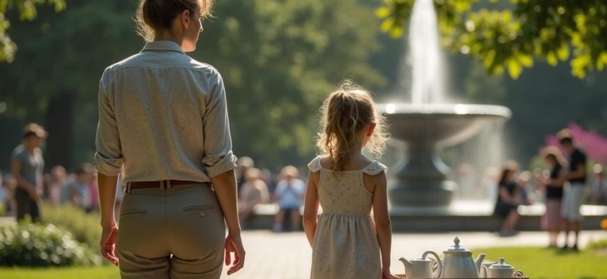 Девочка выглядела растерянной среди парковой суеты, словно оказалась в незнакомом мире.