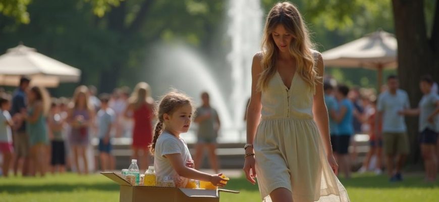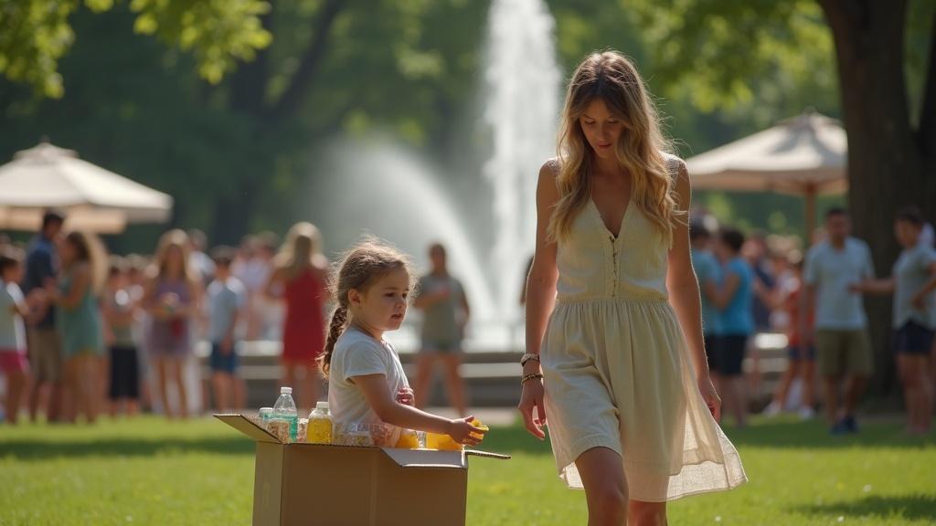 Девочка казалась потерянной среди оживленной атмосферы парка, словно оказалась в чуждом ей мире.