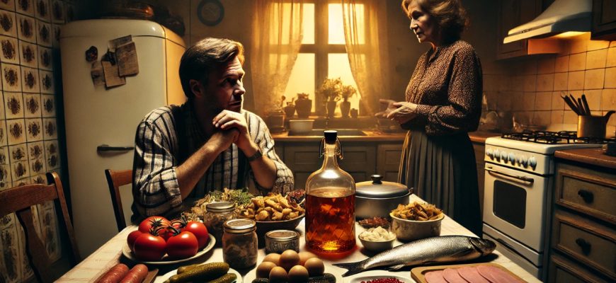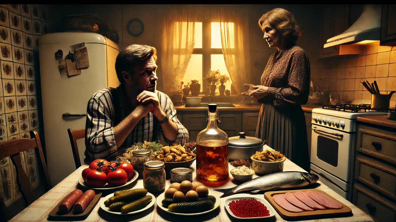 Маргарита зашла на кухню. Макар уже был там. Он сидел за столом. На середине стола стояла бутылка в окружении тарелок с солёными грибами, квашеной капустой, малосольными огурцами, ветчиной, маринованными помидорами, селёдкой с луком, икрой зернистой лососёвой.