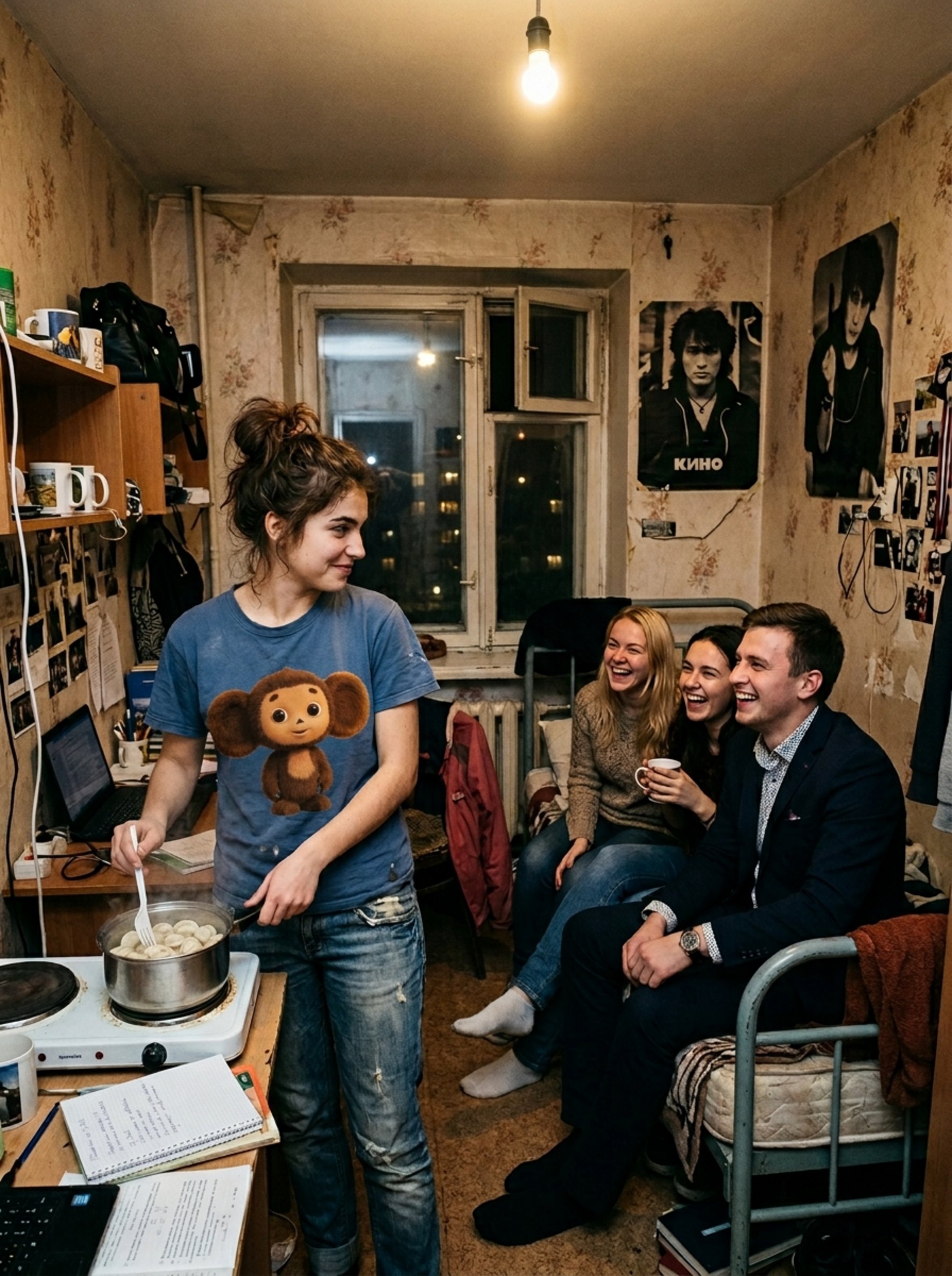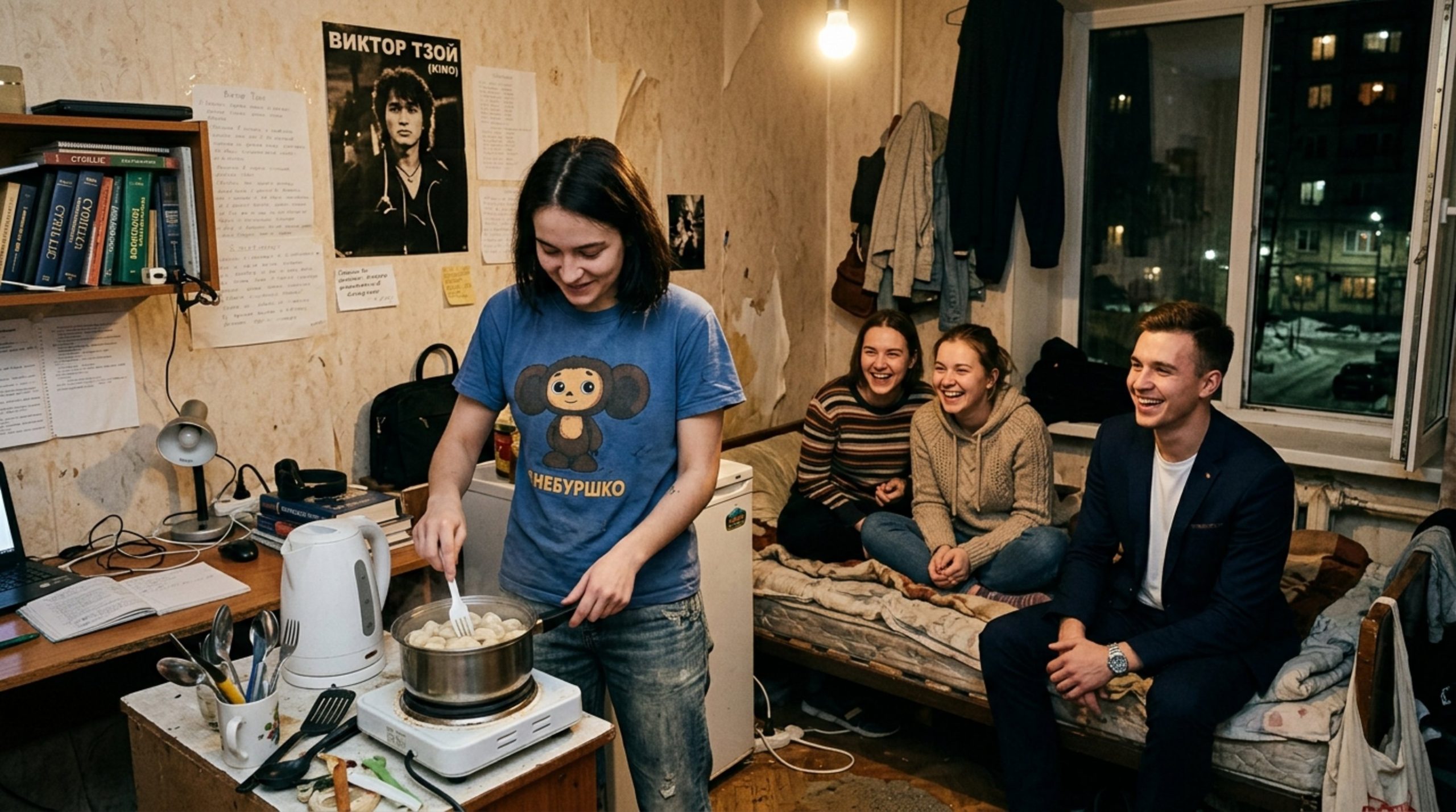 — Прошу внимания, дамы, — объявила она, помешивая содержимое пластиковой вилкой. — Перед вами не банальный ужин, а высокая молекулярная гастрономия в условиях общежития. Прибор именуется «Мультичайник». В нём уже проходили испытания сосиски, гречка и даже борщ. Правда, после борща чай ещё три дня отдавал свёклой, поэтому этот пункт из программы мы вычеркнули. Кому порцию с тонким ароматом кипятильника?