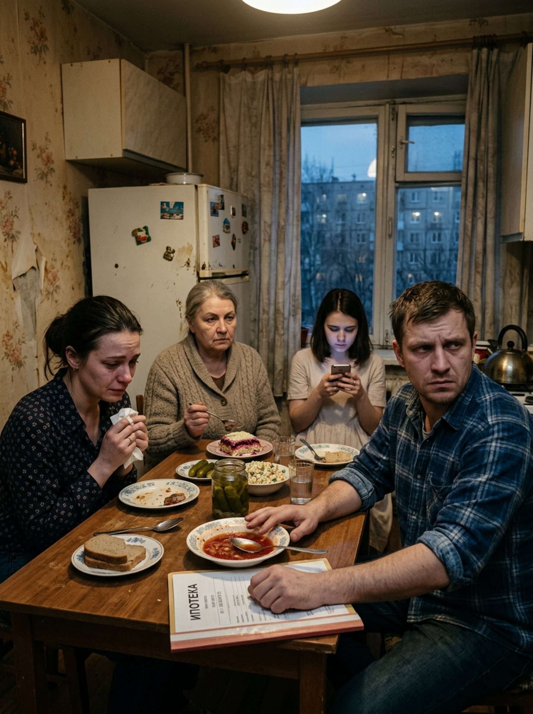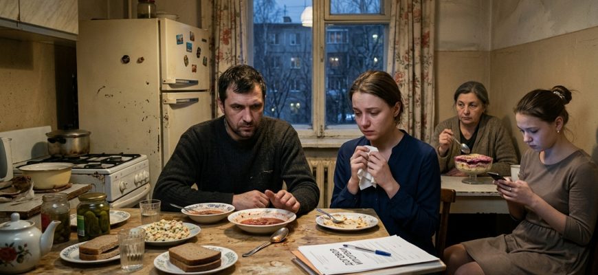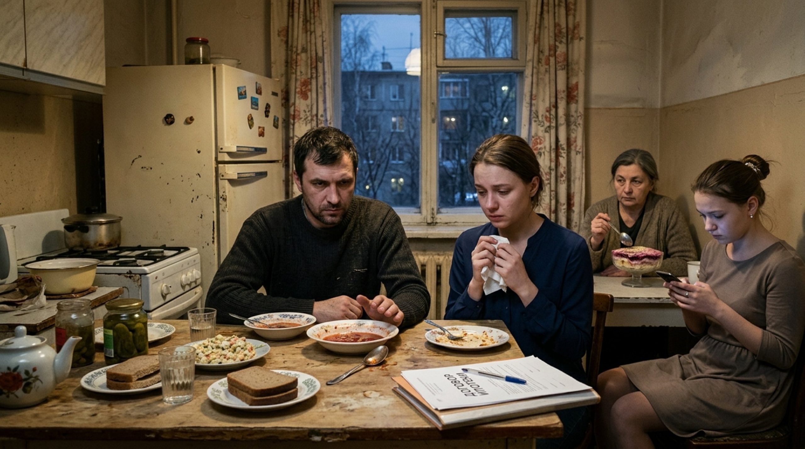 Олег так резко отодвинул от себя тарелку, что ложка ударилась о край и с плеском ушла в борщ. В кухне воцарилась напряжённая тишина, в которой отчётливо щёлкнул старый холодильник, а из двора донёсся надсадный звук — кто‑то безуспешно пытался завести машину, словно и там что‑то не складывалось.