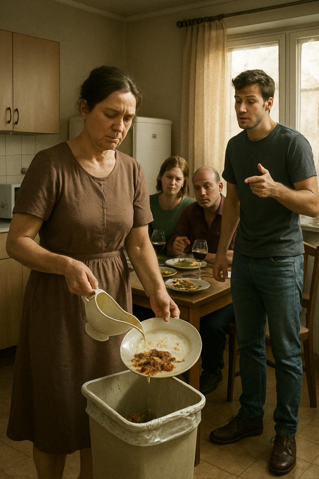 Взяла тарелку мужа с двумя огромными кусками мяса и одним резким движением высыпала содержимое в мусорное ведро под раковиной.