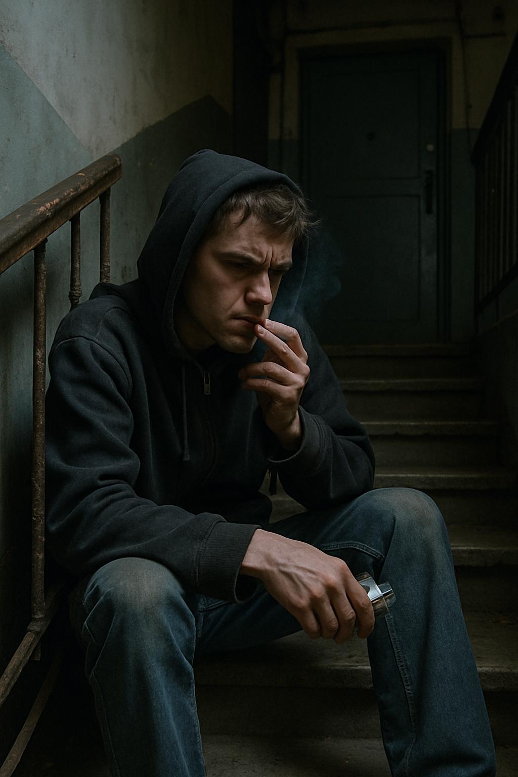 Игорь сидел, прислонившись спиной к облупившимся перилам, которые были потрескавшимися и облезлыми.
