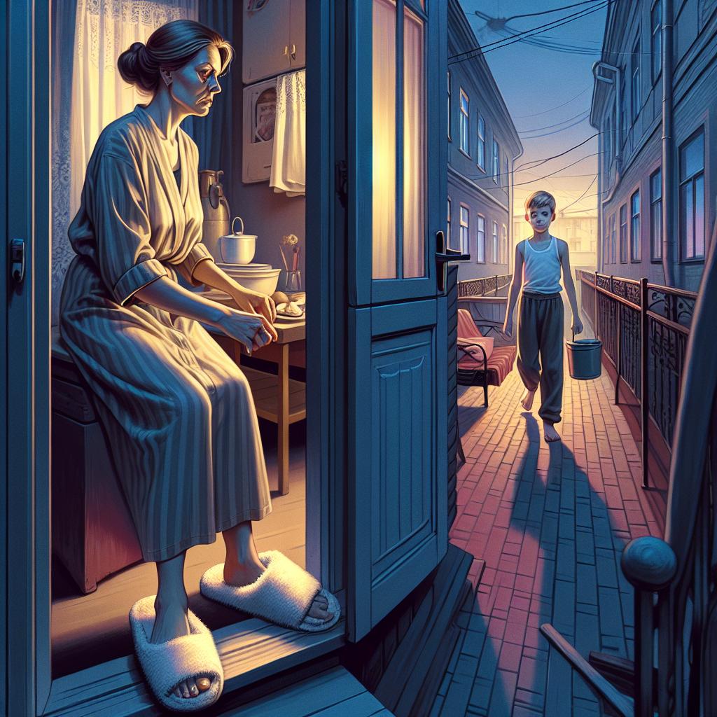 И вправду, маленький Ваня сидел один на скамейке, а на улице уже сгущались сумерки. — Что за мать у него такая? — с раздражением произнесла женщина, надела тапочки и направилась к выходу из квартиры.