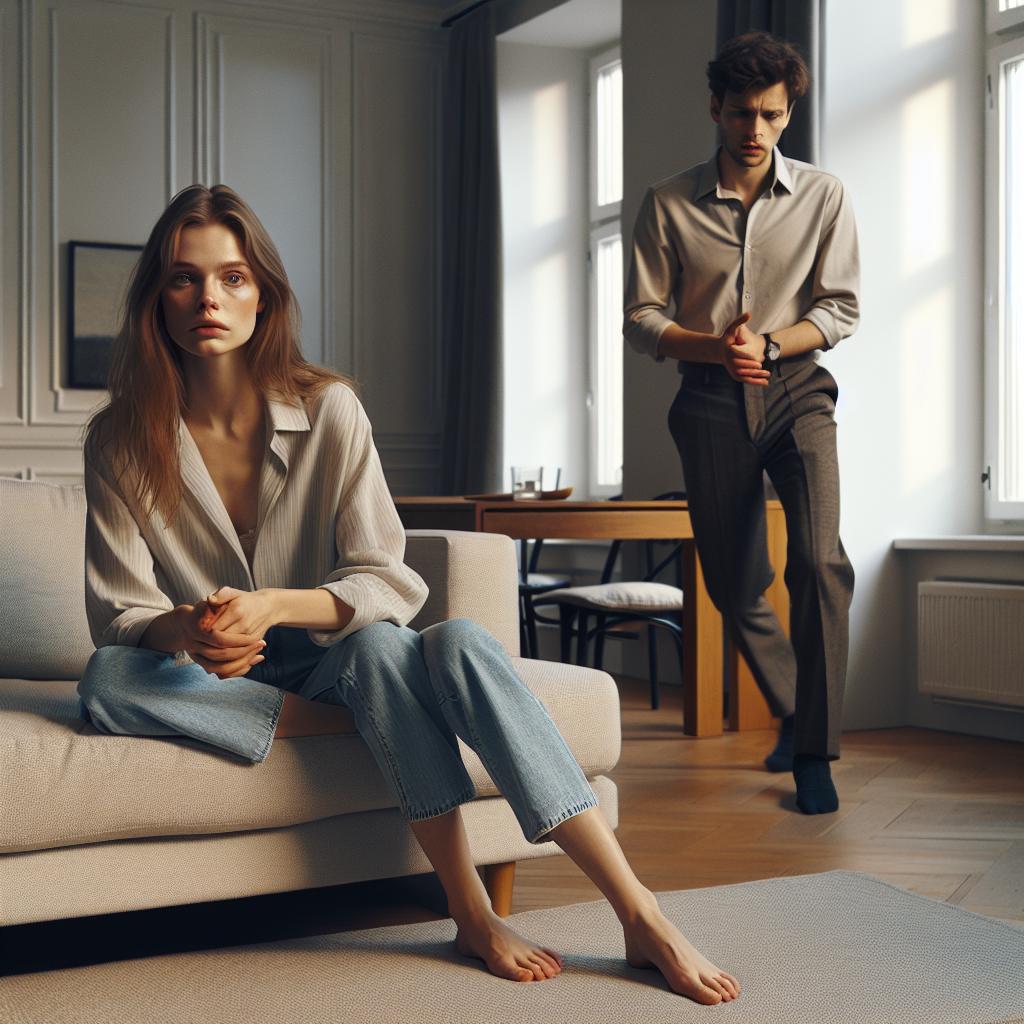 Алина удивилась — ведь она уже сидела. Однако жених, казалось, не замечал очевидного. Он начал нервно ходить по комнате, то останавливаясь напротив неё, то поворачиваясь к окну. Его руки то сжимались в кулаки, то расслаблялись. Он приоткрывал рот, будто собираясь заговорить, но молчал, проводя ладонью по лицу.