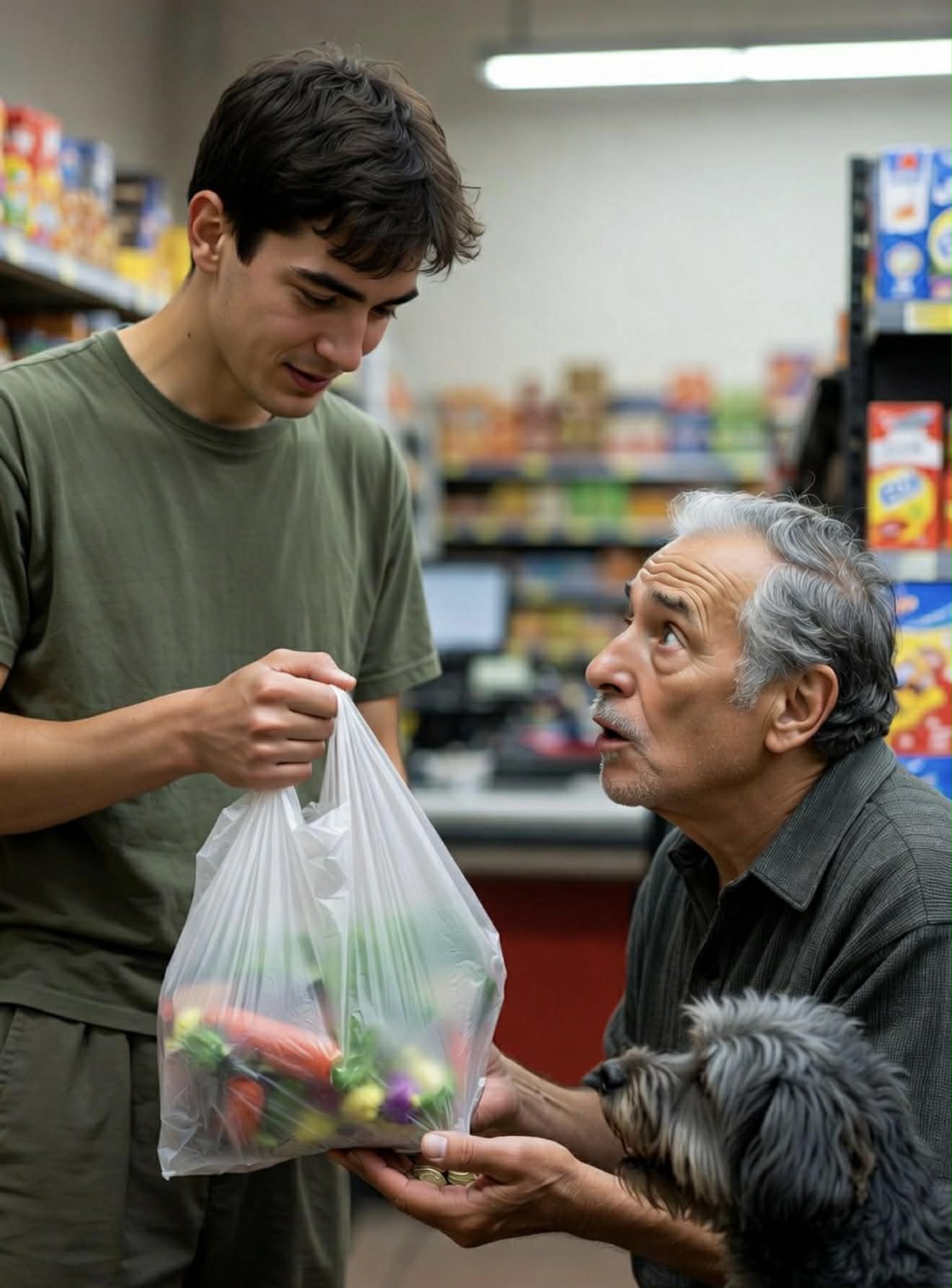 — Да тут, за углом, в старом доме… Спасибо тебе, добрый человек, дай бог тебе здоровья, — бормотал старик, прижимая продукты к груди. Пёс, словно поняв, что беда миновала, коротко гавкнул и вильнул хвостом.