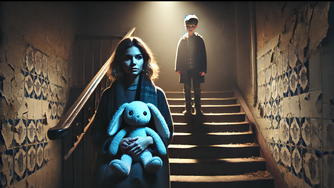 В руках женщина сжимала голубого плюшевого зайца с заплатками и потёртыми ушами.