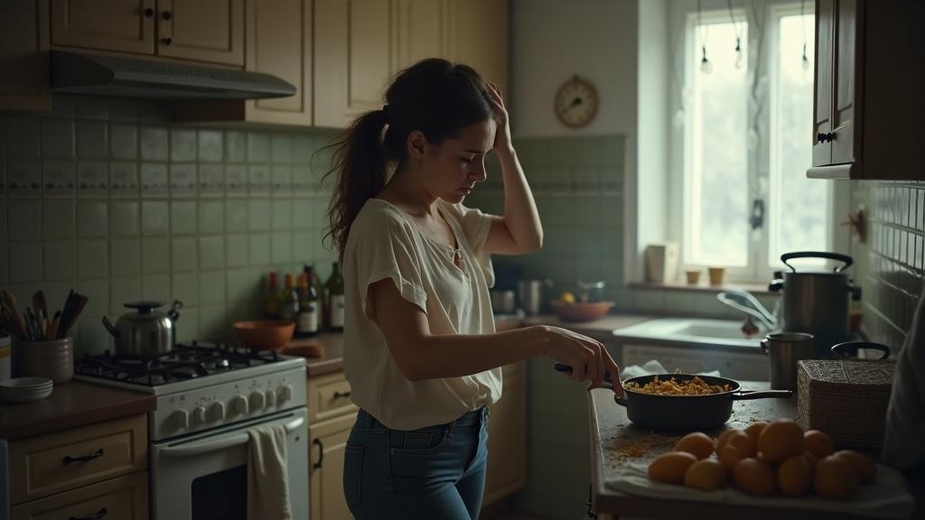 В кастрюле тихо варились макароны, а сковородка источала дым — Ольга снова пересолила котлеты.