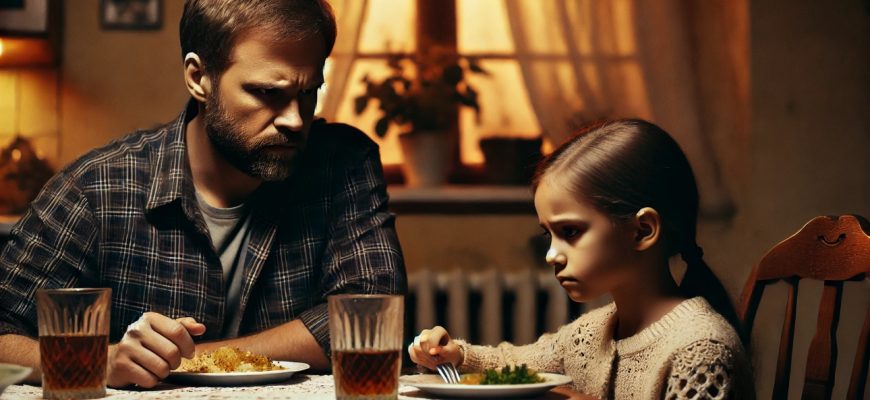 — Перестань чавкать! — раздражённо бросил Олег, посмотрев на шестилетнюю Дашу. Девочка мгновенно замерла, её глаза наполнились слезами.