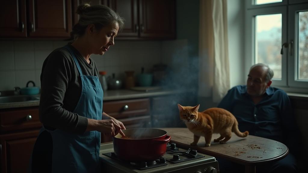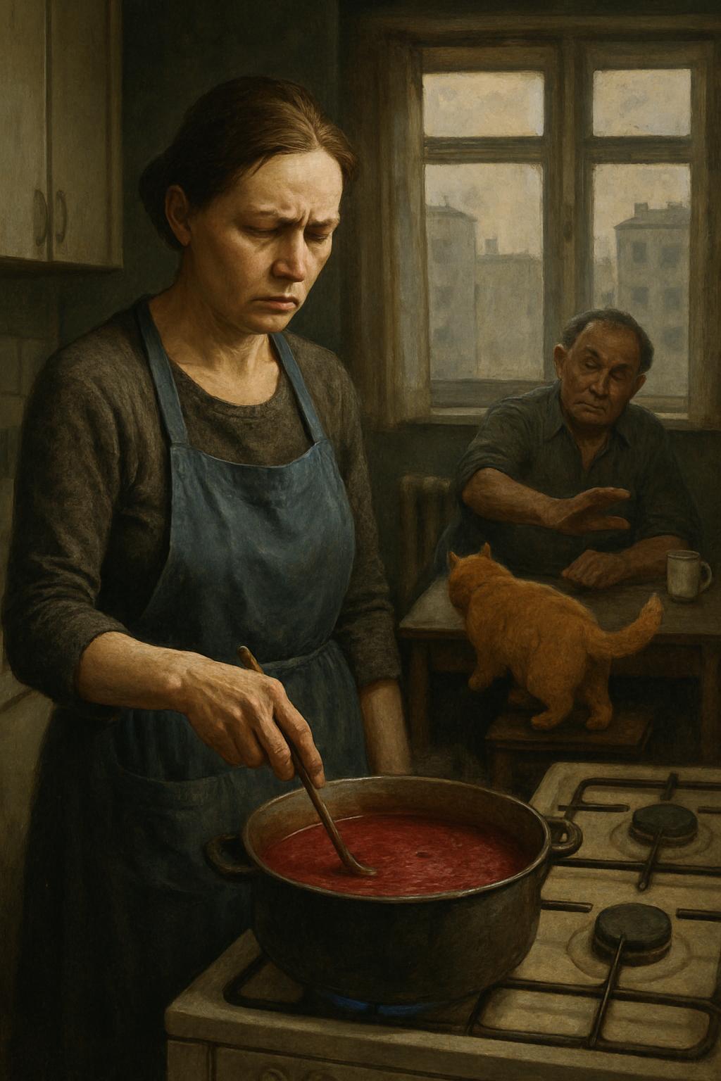 Она стояла у плиты, медленно помешивая остывающий борщ, и внутри нарастало тяжёлое, глухое чувство обиды. — Почему молчишь? — муж не унимался, наслаждаясь своей властью. — Я тебе, между прочим, рассказываю суровую правду жизни.