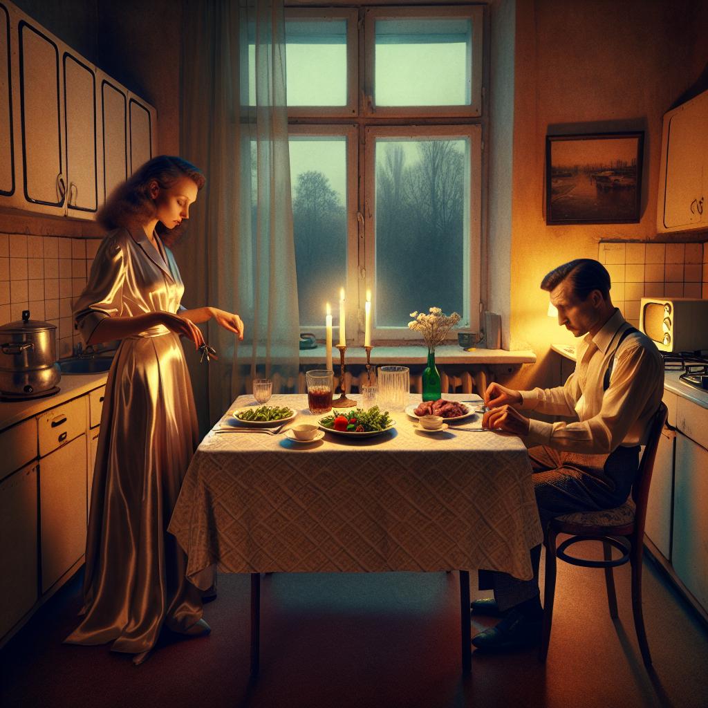 На столе стояли два бокала, тарелки с еще теплым мясом и салатом, а в центре горели две тонкие свечи, отбрасывая дрожащие тени на стены.