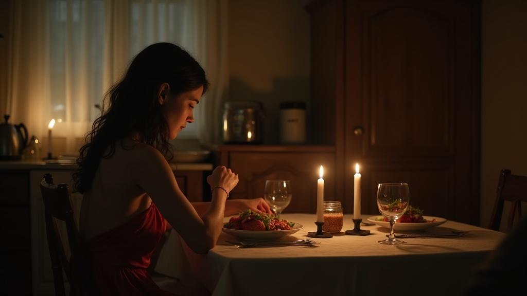На столе стояли два бокала, тарелки с еще теплым мясом и салатом, а в центре горели две тонкие свечи, отбрасывая дрожащие тени на стены.