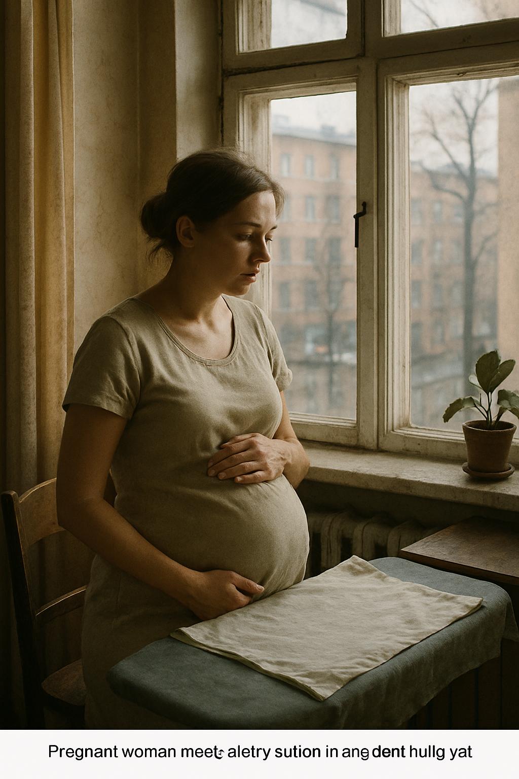 У окна стояла беременная женщина и аккуратно гладила бельё.