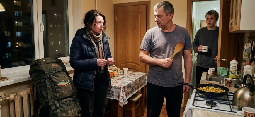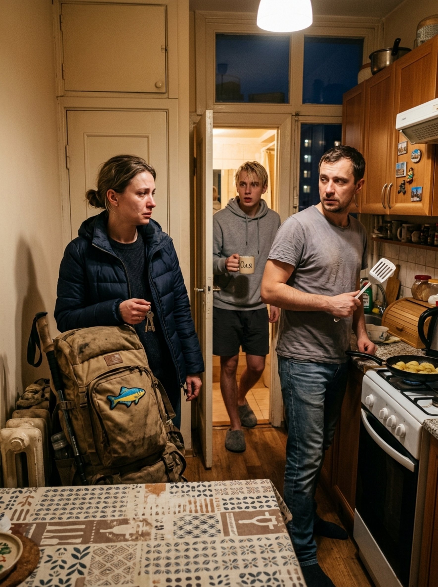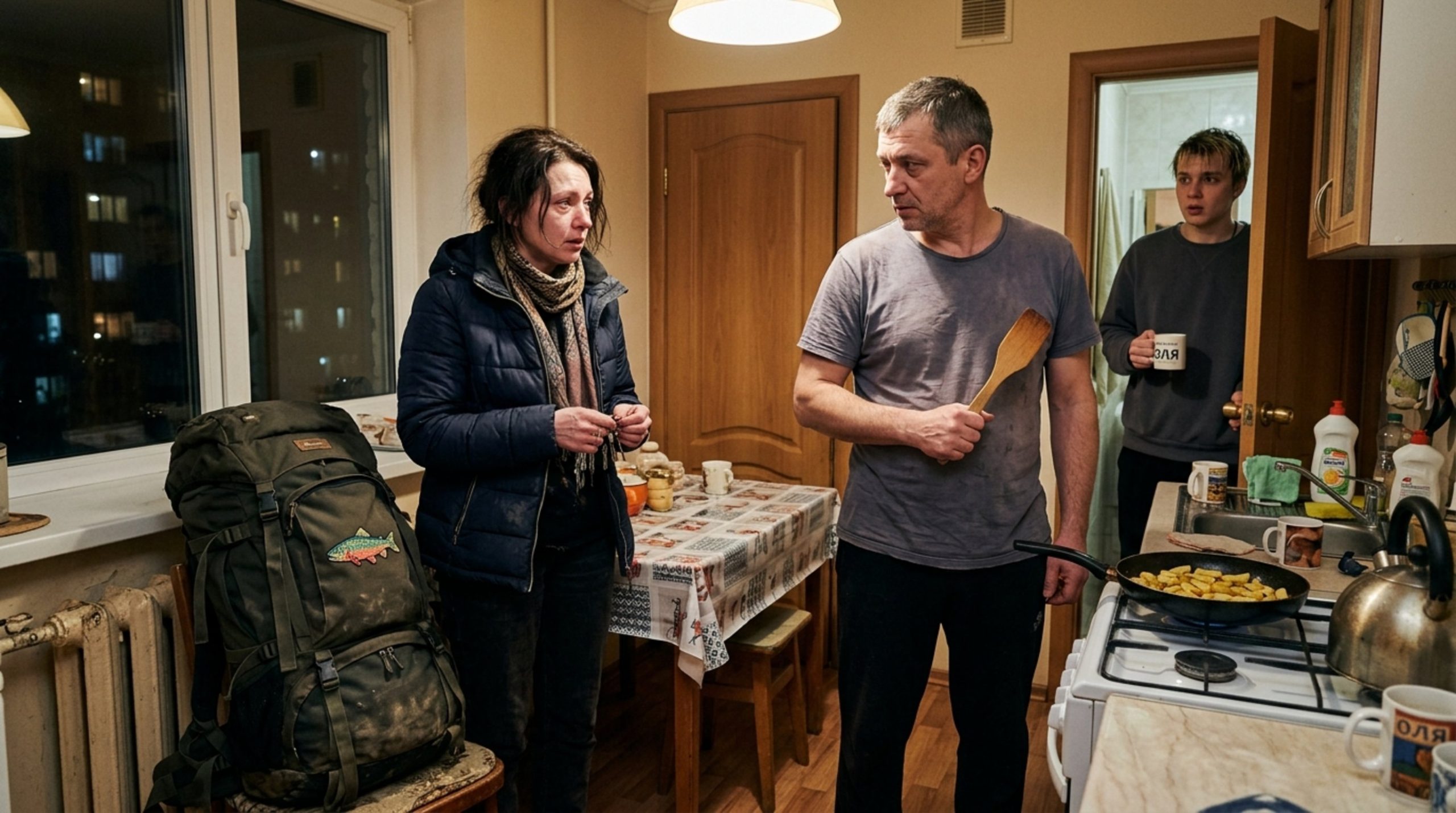 Тарас стоял у плиты в домашней футболке и держал лопатку так, будто это был щит от предстоящего разговора. Его обычно спокойное лицо размякло, взгляд метался — то к жене, то к рюкзаку, то к двери спальни.