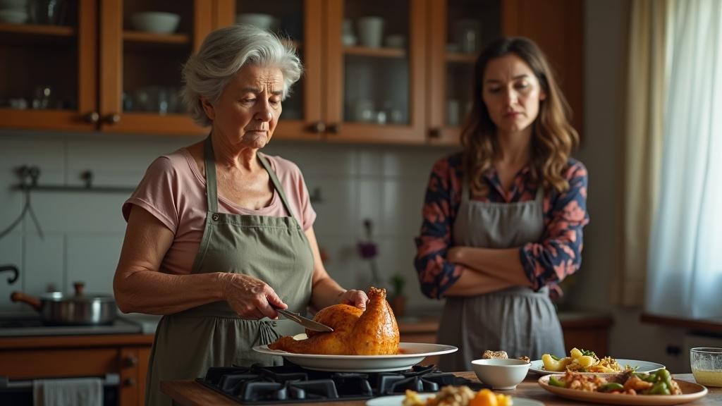 Тамара Сергеевна стояла у плиты и с нежностью снимала с противня золотистую, шипящую курицу.