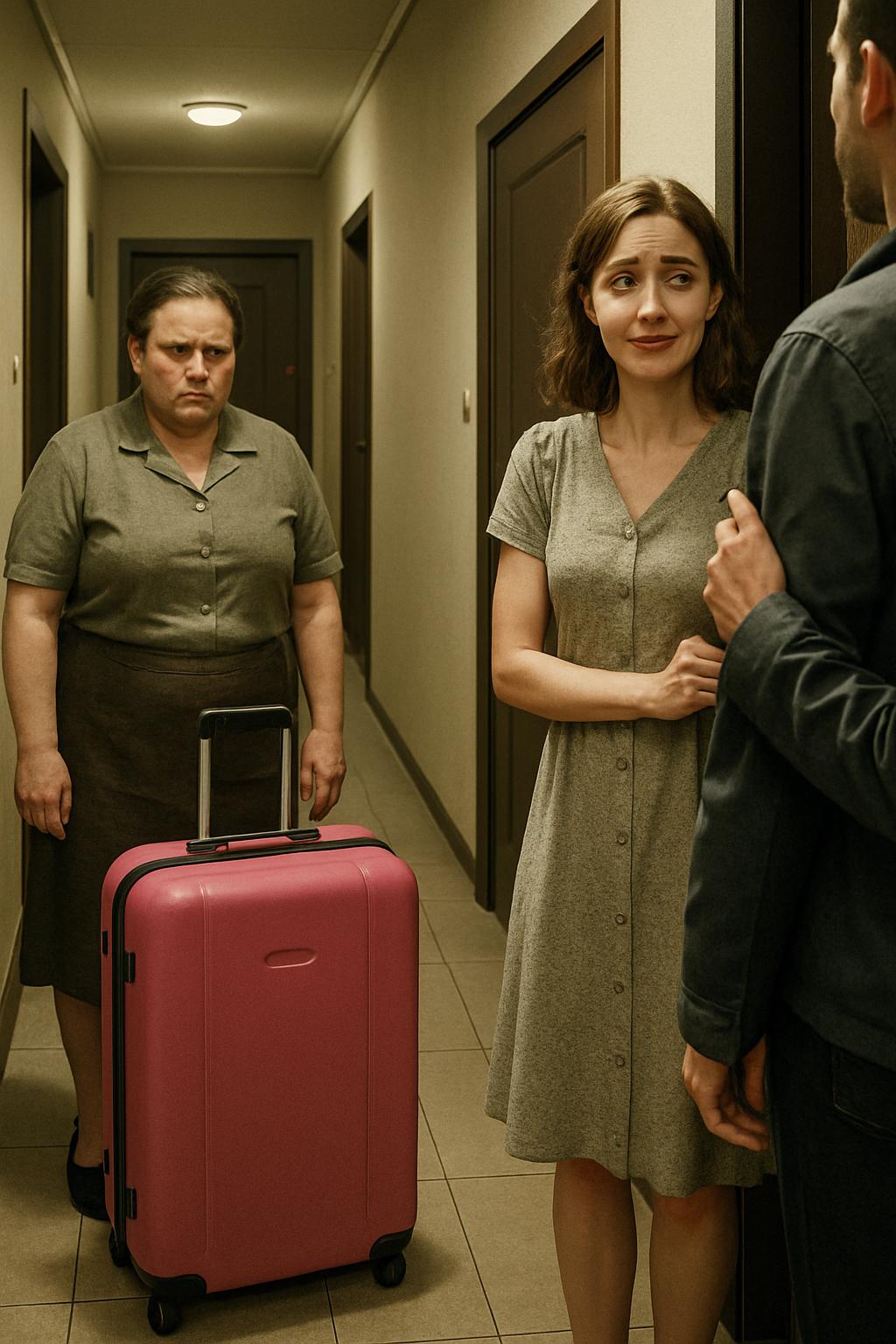 Розовый чемодан на колёсиках преградил узкий коридор, словно настоящая баррикада.