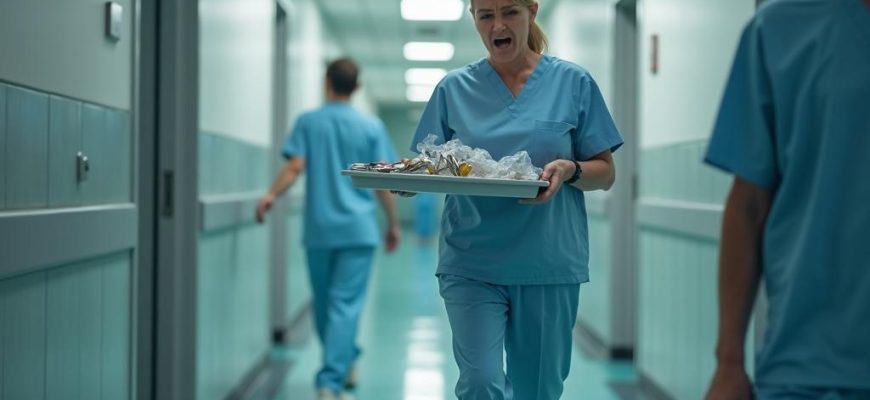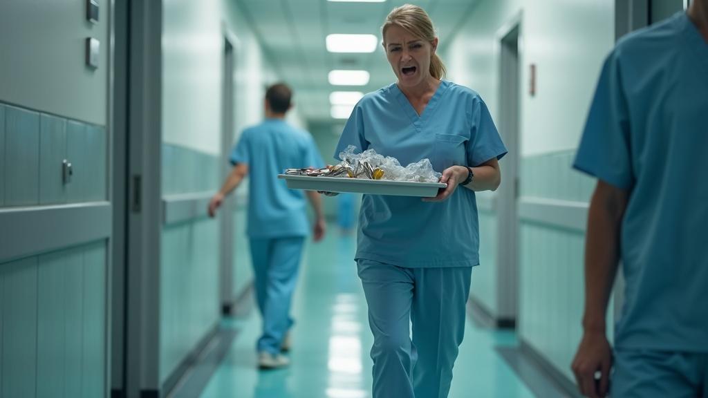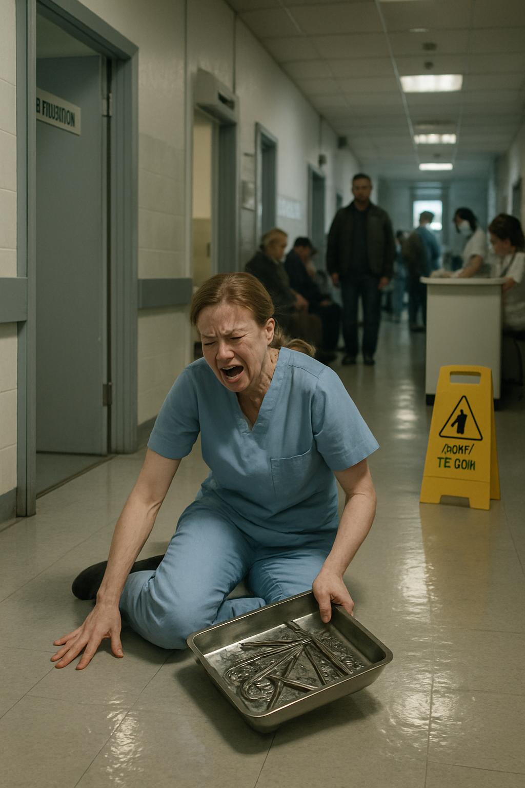 Женщина несла лоток с использованными инструментами, когда внезапно нога поскользнулась вперёд.
