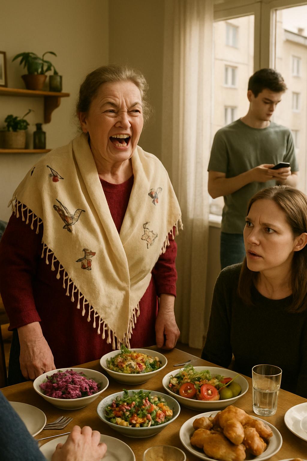 Тамара Сергеевна стояла возле стола, уставленного салатами и разнообразными угощениями, а на её плечах была кремовая шаль с ручной вышивкой птиц.