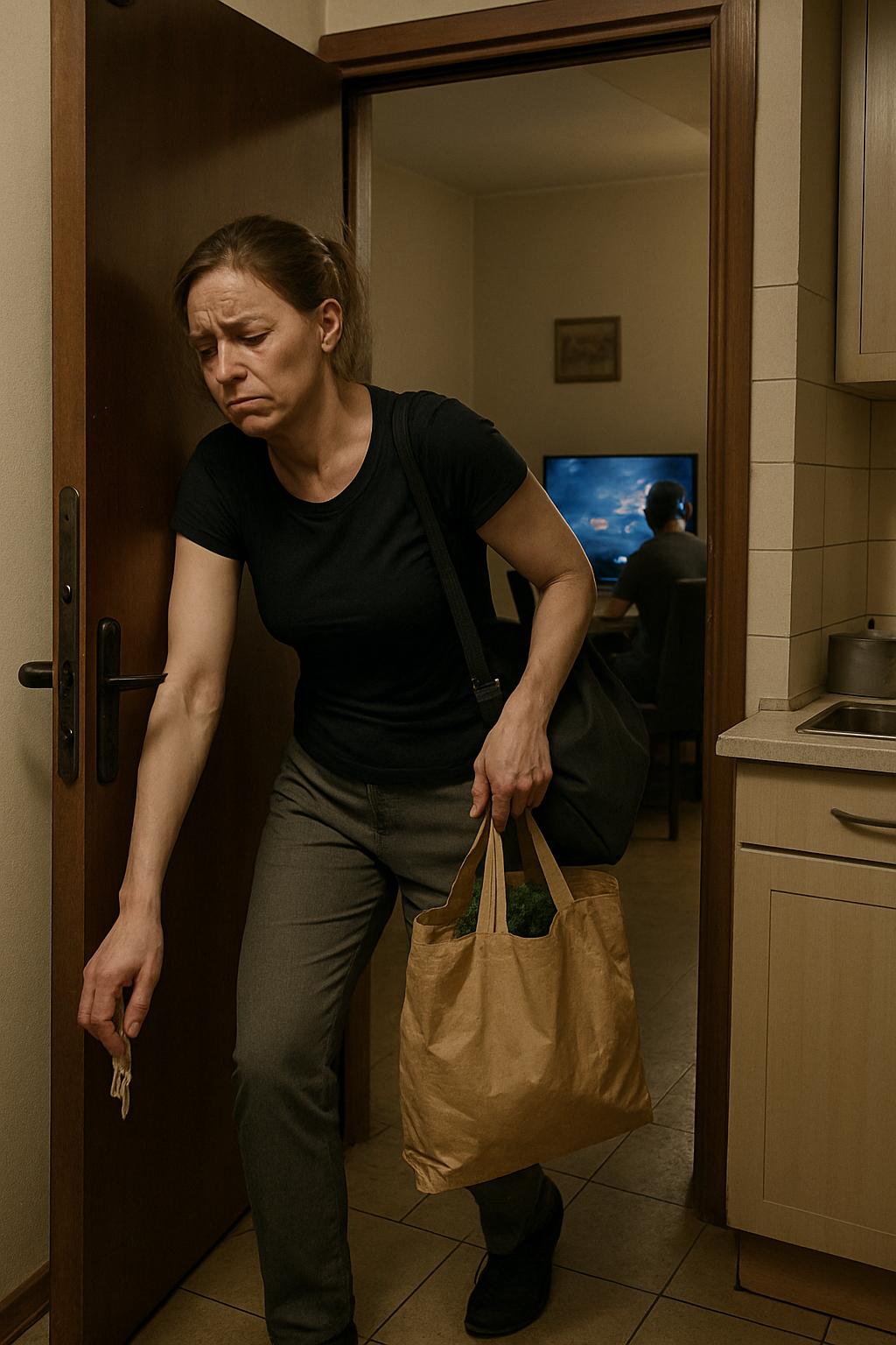 Ольга толкнула дверь квартиры плечом, удерживая в одной руке сумку с ноутбуком, в другой — пакет с продуктами.