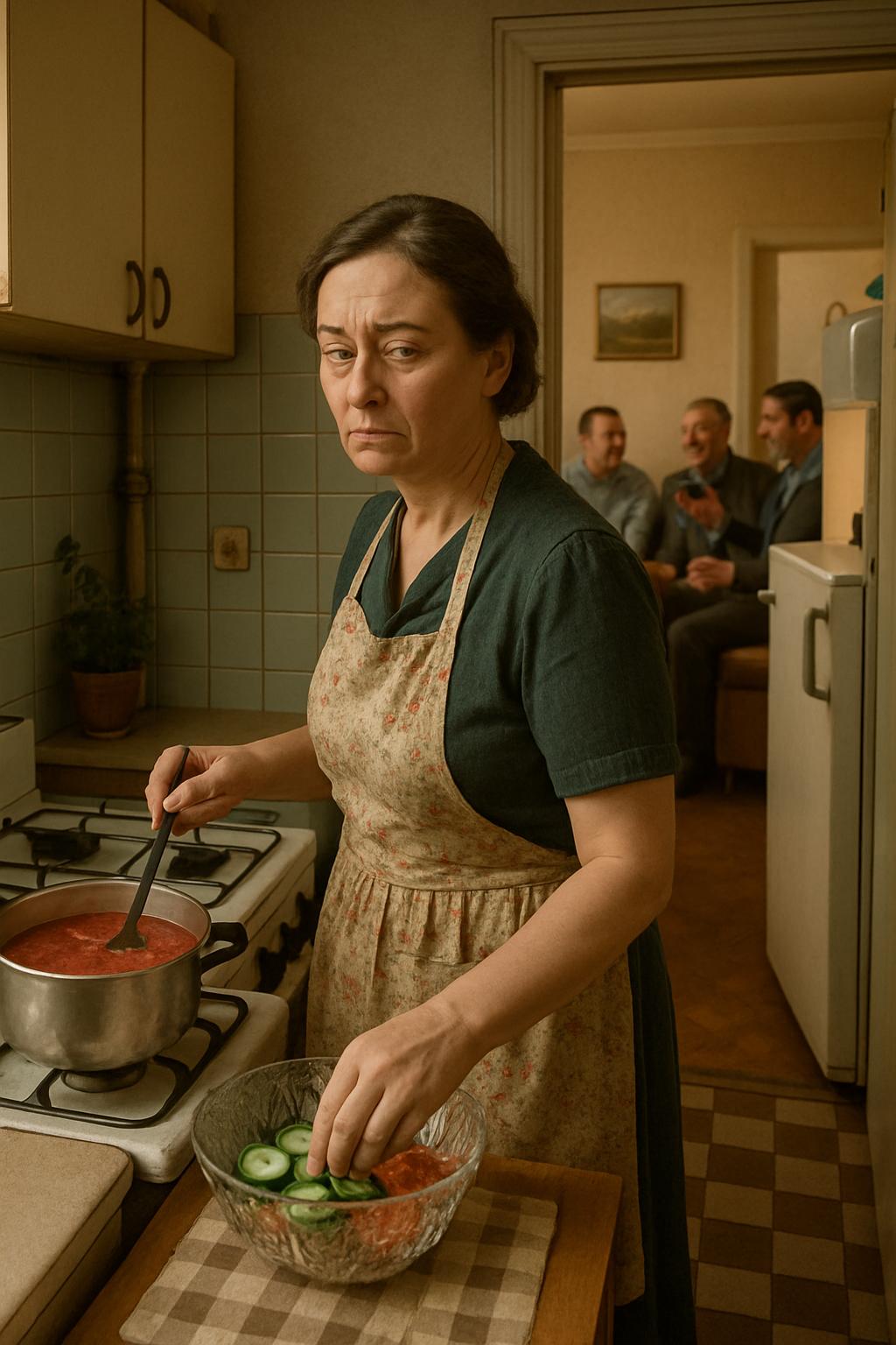 Смех мужчин эхом разносился по кухне, а она молча раскладывала салат в хрустальную салатницу — именно ту, что подарила свекровь тридцать лет назад. — Оль, а где солёные огурцы? — крикнул муж из гостиной. — И достань холодную водку!