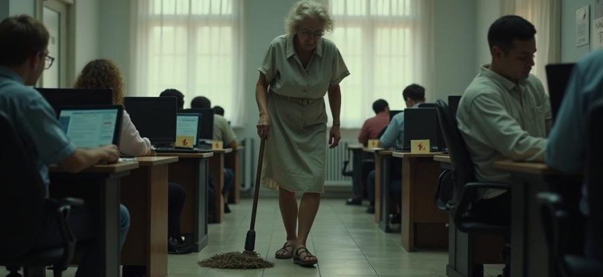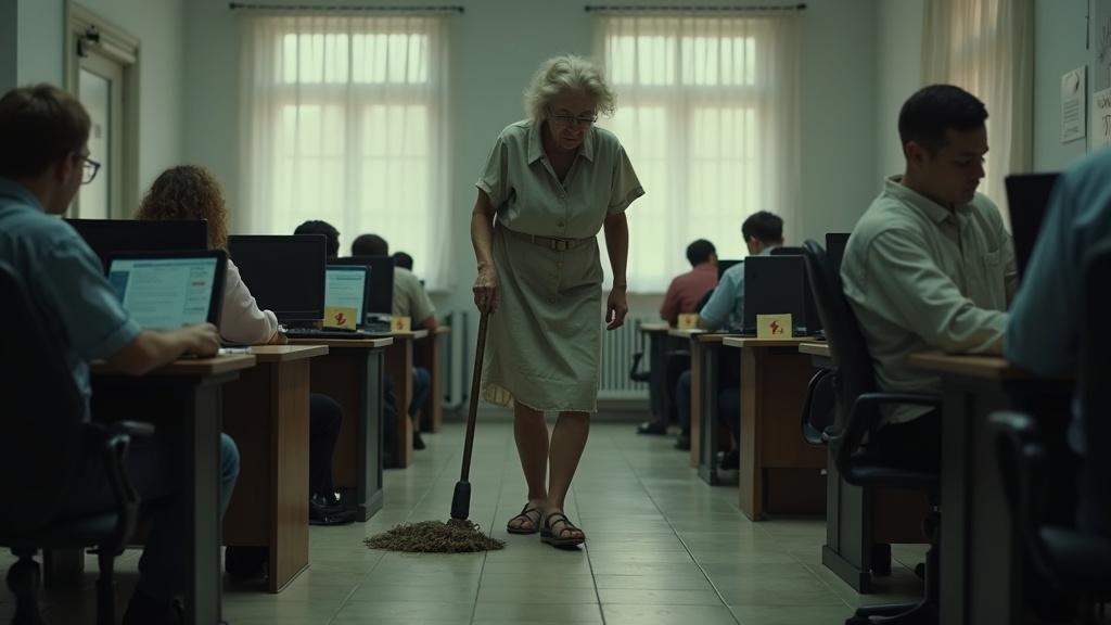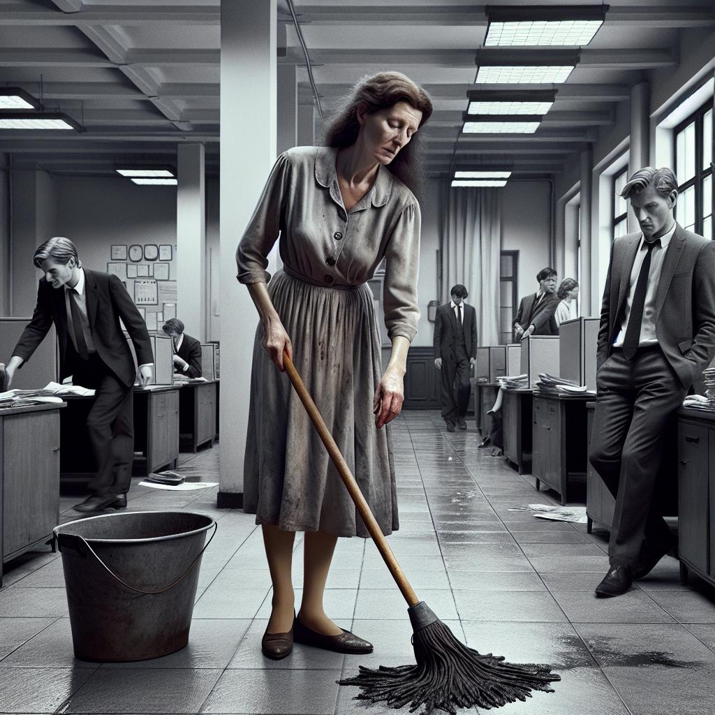 Она мыла полы, протирала пыль, выносила мусор, опуская взгляд и словно не замечая насмешек, доносящихся из-за стеклянных перегородок.