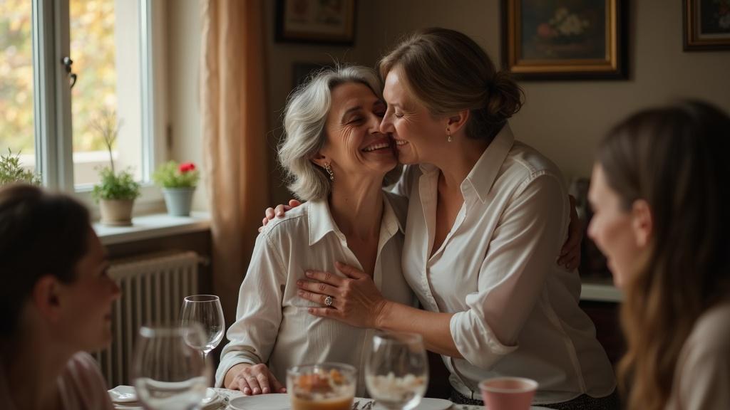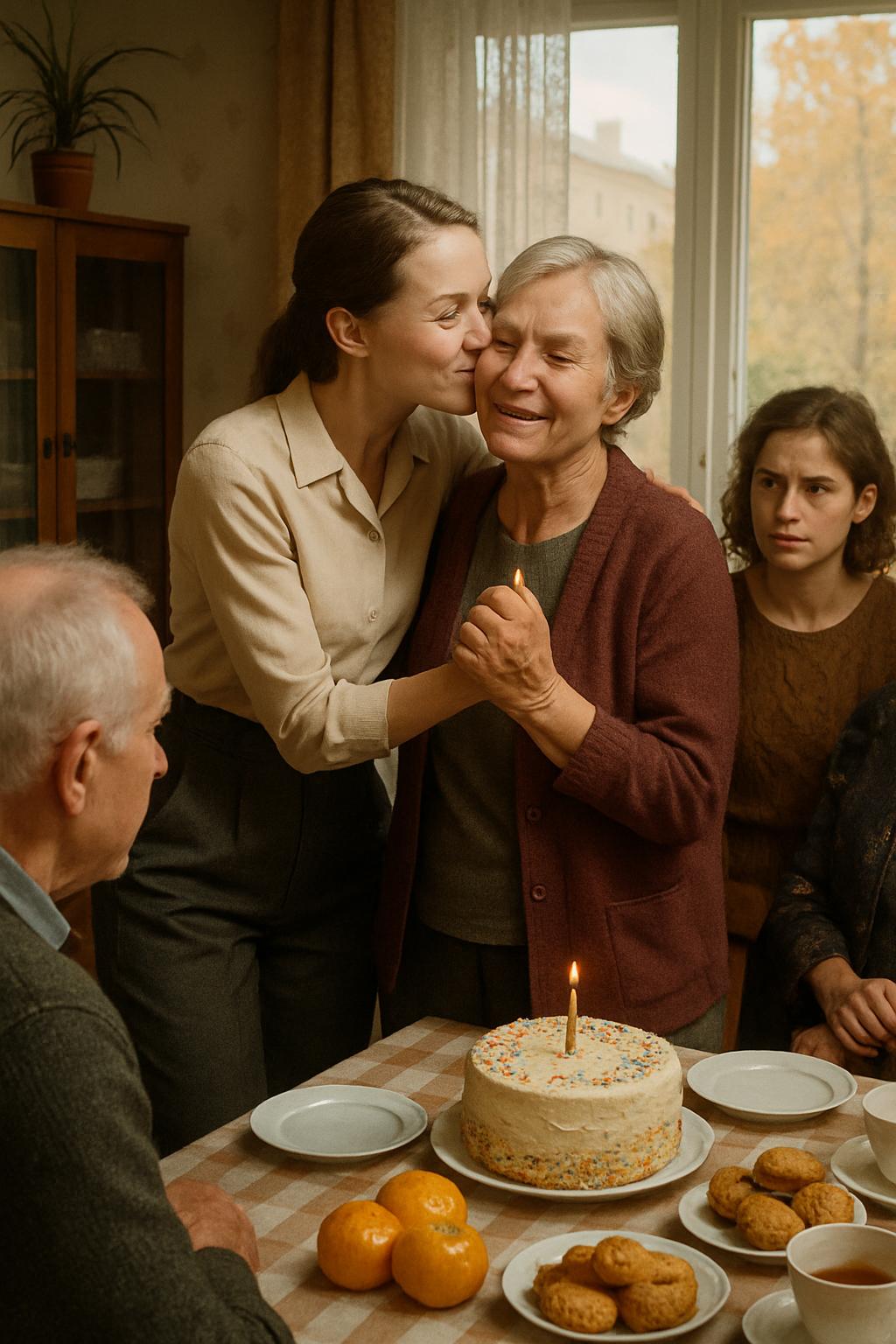 — Мама, с днём рождения! — с широкой улыбкой Ольга поцеловала мать в щёку. — Поздравляю вас, — подхватил поздравление муж Ольги.