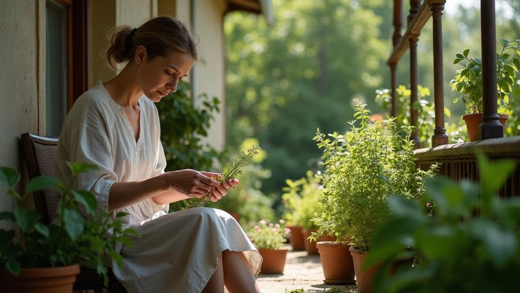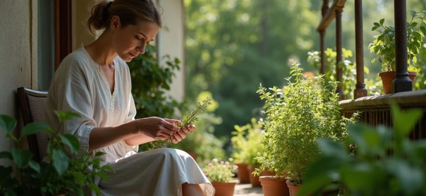 Татьяна устроилась на веранде дачного домика, перебирая травы для сушки.
