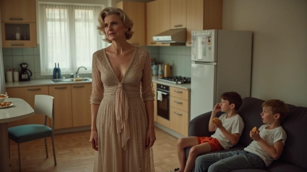 На Елене было надето роскошное блестящее платье с глубоким декольте, причёска была аккуратно уложена, а на лице — яркий праздничный макияж.