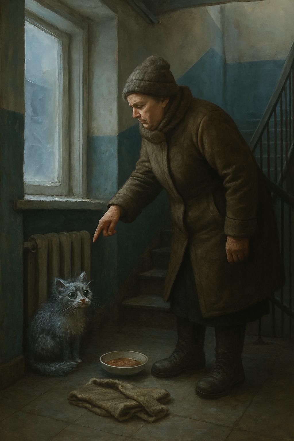 Кошка виновато глядела, молча перебирая замёрзшими от холода лапами по краю лужицы, образовавшейся из растаявшего льда на её шерсти.