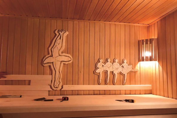 После ремонта новые полоки, крепежи и перегородки выполнены из липы – дерева, которое практически не нагревается. Парную украсили декоративными фигурами Щелкунчика и Мышиного короля, а на стенах балерины танцуют партию из «Лебединого озера».