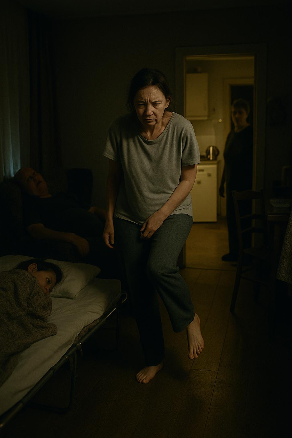 Она направлялась на кухню за стаканом воды, как вдруг острым ударом пальца ноги наткнулась на ножку скрипучей раскладушки.