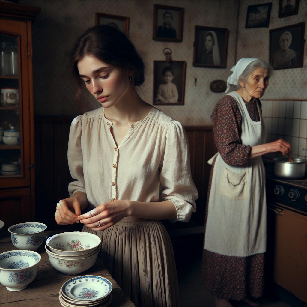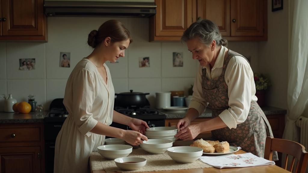 Елена расставляла фарфоровые тарелки, доставшиеся семье от бабушки Игоря, и невольно наслаждалась теплотой и уютом дома, где прошло детство её жениха. Всё здесь говорило о семейных традициях: фото на стенах, вышитые салфетки, старинный буфет с хрустальной посудой.