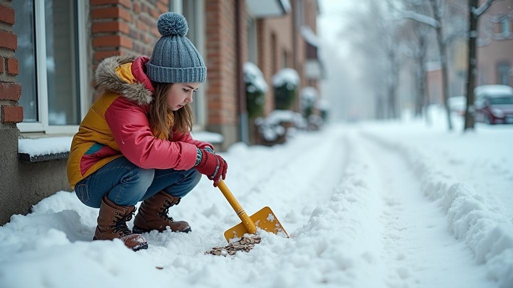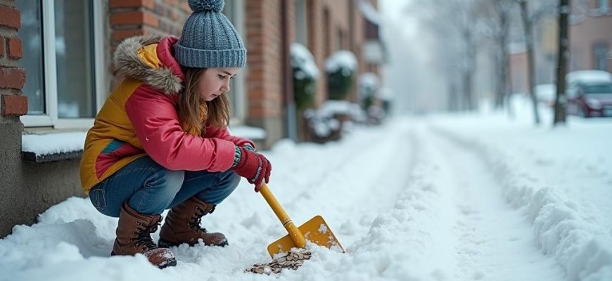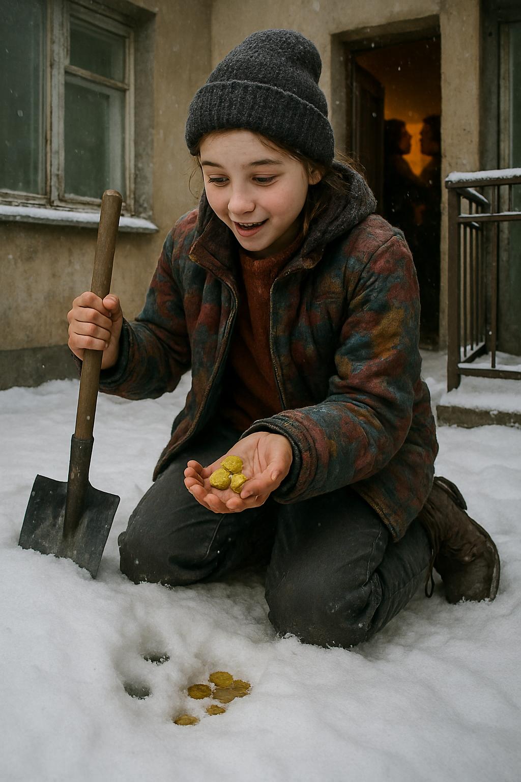 Сдвинув лопатой снег, Оля обнаружила сверкающие мелкие монетки — мелочь.