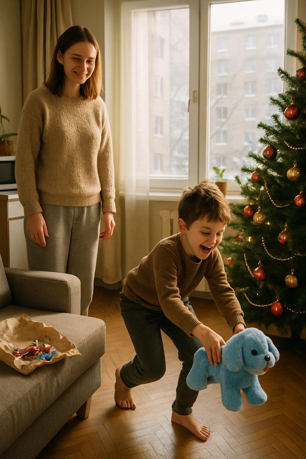 Сладости он откладывал в сторону, внимательно разглядывая игрушки… Спустя некоторое время, получив очередной подарок, Илья аккуратно разложил его содержимое по дивану, тронул каждую конфету, коробку с пожарной машиной, а потом собрал всё обратно. — Илья, тебе подарок Деда Ивана не понравился? — с интересом спросила Татьяна. — Нет, мама, он очень хороший! — воскликнул мальчик. — Тогда почему у тебя такое огорченное лицо? — Мамочка, я очень хочу настоящую собаку.