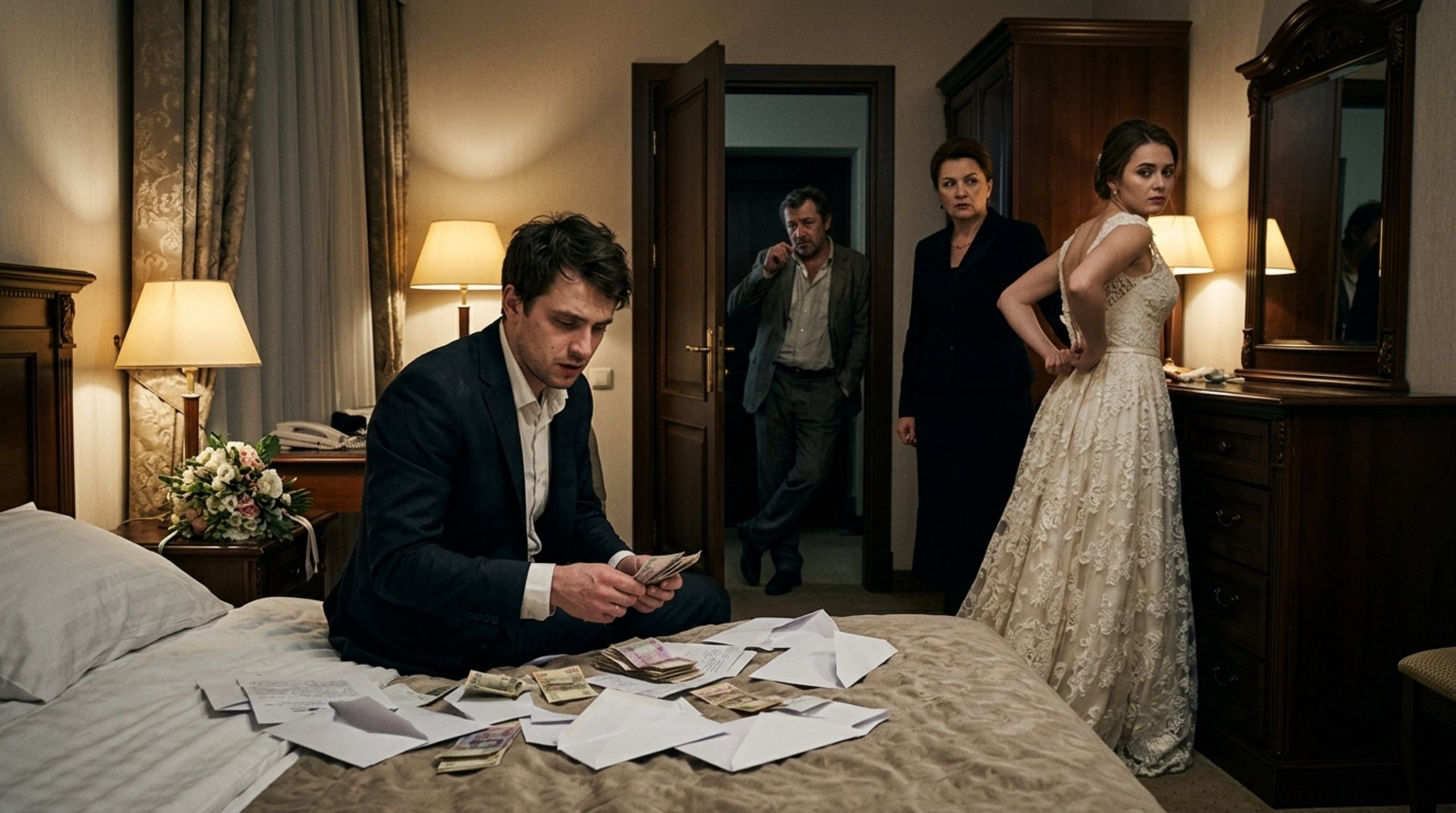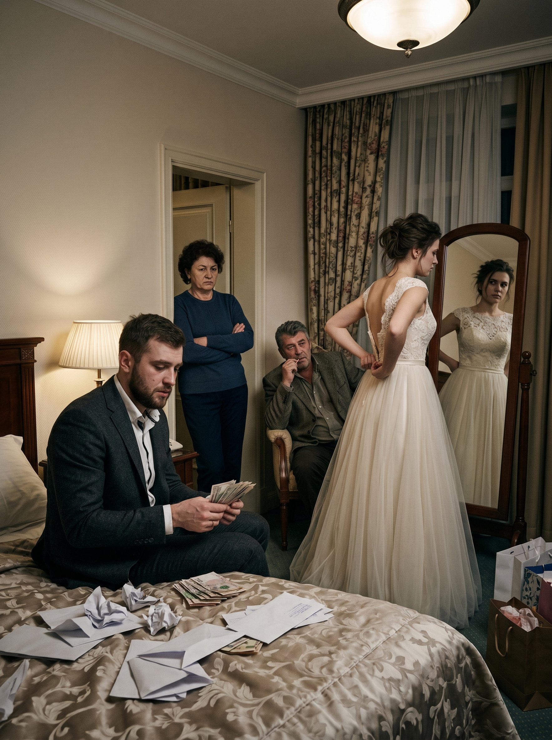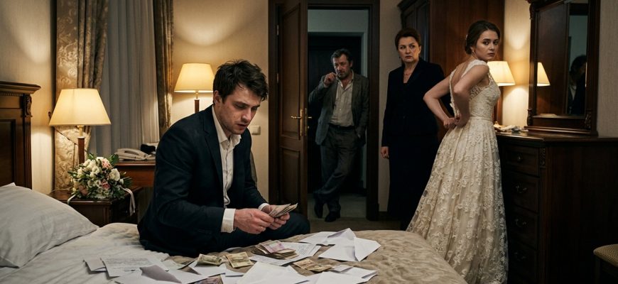 Оксана стояла перед зеркалом, тщетно пытаясь справиться с молнией на тяжёлом свадебном платье. Услышав его тон, она медленно повернулась. Внутри поднимался неприятный холод. Всего час назад они кружились в танце, принимали поздравления и улыбались в объективы, а теперь в гостиничном номере повисла удушливая тишина.