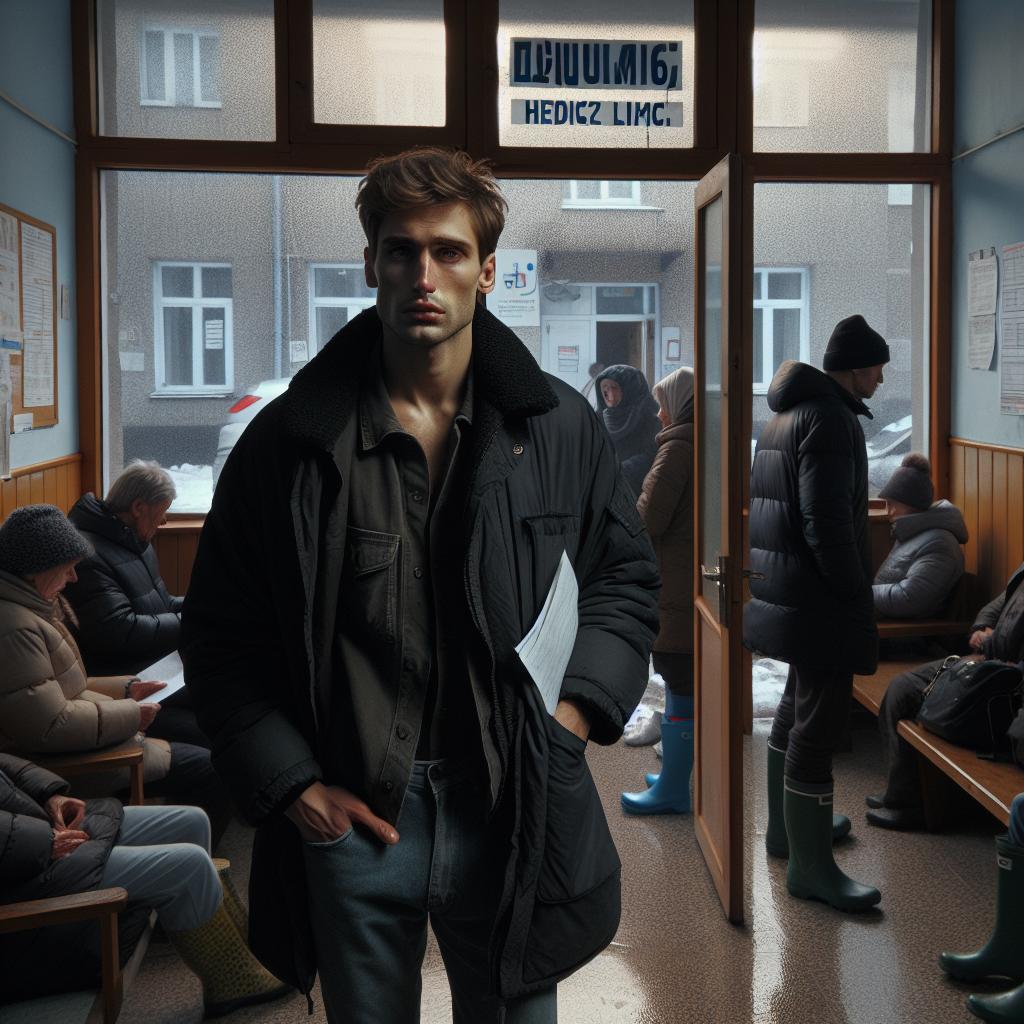 У входа в поликлинику толпились люди в резиновых сапогах и коротких пуховиках, все пытались укрыться от пронизывающего ветра.