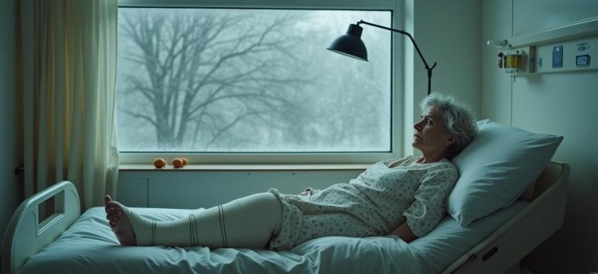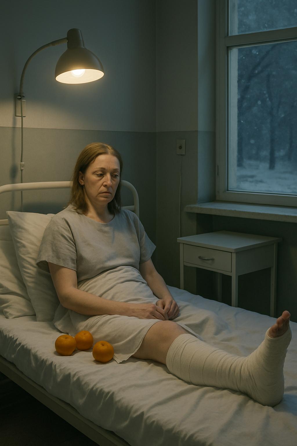 Нога была в гипсе, над потолком висела мутная лампа, а за окном падал серый снег.