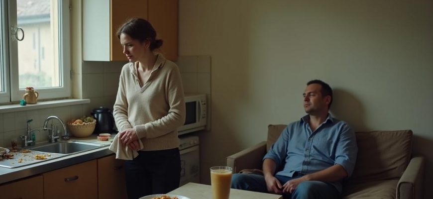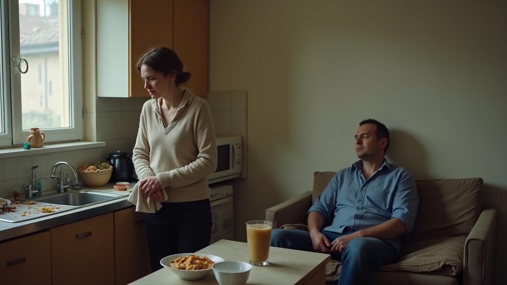 Ольга отложила телефон и взглянула на груду грязной посуды. На кухне был беспорядок — остатки завтрака, рассыпанные крошки, липкие пятна на столе. А в соседней комнате Игорь смотрел сериал, удобно устроившись на диване.