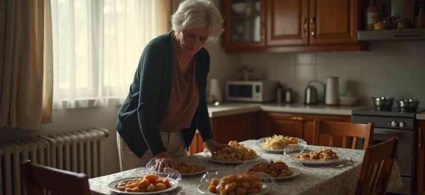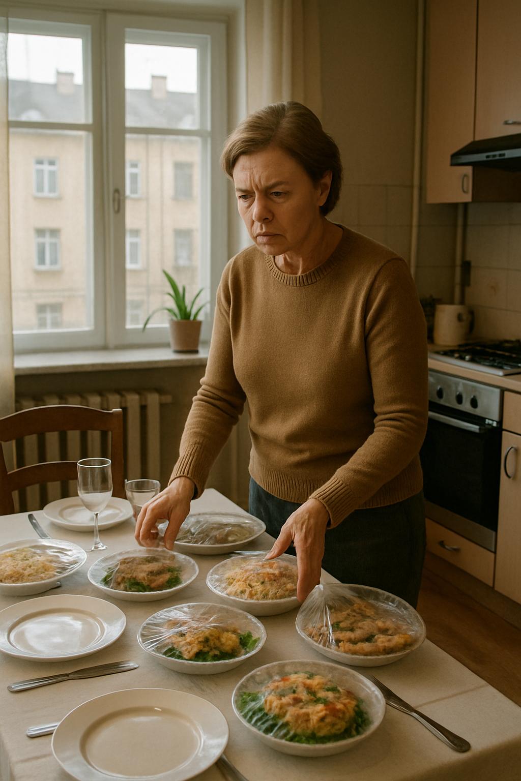 Марина же продолжила суетиться на кухне, хотя всё было готово — блюда разложены по тарелкам и аккуратно накрыты пищевой плёнкой, чтобы не заветрились.